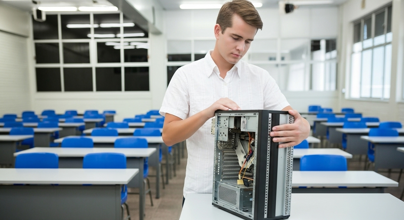 El Técnico en Soporte y Mantenimiento de Equipo de Cómputo se prepara para diagnosticar, reparar y dar mantenimiento preventivo y correctivo a computadoras y periféricos. Su formación incluye hardware, software, redes básicas, sistemas operativos, instalación de programas y seguridad informática inicial.
